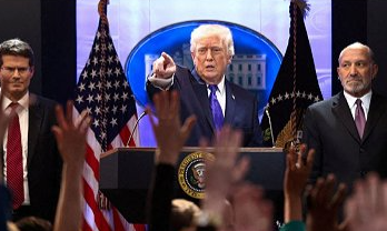 Item 1 of 2 U.S. President Donald Trump arrives for a press briefing at the White House, following the Supreme Court’s ruling that Trump had exceeded his authority when he …
